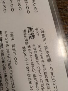 先日は、行きつけのイワシ料理店での懇親会にて「雨降(あふり)」をいただいてきました。